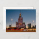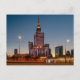 The iconic Palace of Culture skyscraper in Warsaw, Poland lit up with light trails coming from the vehicles driving through the city at night.