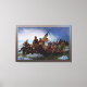The artwork depicts General Washington standing in a boat with his army following him with horses and armaments as they cross the Delaware River.