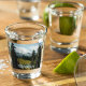 Shot glass that features a scenic photo image of snow capped Mount Rainier and surrounding landscape in the Cascade Mountains of the Pacific Northwest state of Washington. A great barware and travel souvenir gift idea!