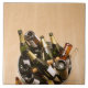 Asset ID: sb10066533i-001 / Peter Dazeley / Waste bin full of empty champagne bottles on wooden floor, high angle view