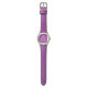 Rainbow coloured numbers with minute hashes at outside. Central design is three triangles in orange, pink and yellow. All on a purple background.