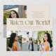 Modern and minimal graduation announcement photo card featuring 3 photos on the front and 1 on the back. The text at the top says "watch out world!" Add the graduate's name, information, and message to personalize this card. Cream color.
