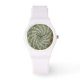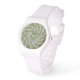 Crochet pattern in the round. Variegated greens as a background and white as the spiral arms radiating out from the centre. Numerals are white with drop shadow and sit approximately atop the white spiral arms.