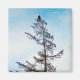 A photograph of an American Bald Eagle perched atop a tall Pine Tree. A blue sky with misty clouds are in the background. Traces of sunlight and snow can be found on the tree and it's branches.