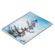 A photograph of an American Bald Eagle perched atop a tall Pine Tree. A blue sky with misty clouds are in the background. Traces of sunlight and snow can be found on the tree and it's branches.