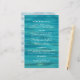 Budget wedding menu with ocean beach background. Water ripples is the background for custom, white text. The names of the bride and groom are in the centre of the paper. Customise four sections with menu information.