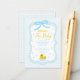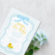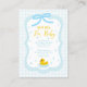 Baby blue gingham baby shower with a hand drawn bow. Water droplets frame a rubber duck surrounded by bubbles