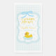 Baby blue gingham baby shower with a hand drawn bow. Water droplets frame a rubber duck surrounded by bubbles