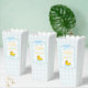 Baby blue gingham baby shower with a hand drawn bow. Water droplets frame a rubber duck surrounded by bubbles