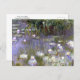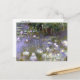 A fine art postcard featuring the impressionist painting, Water Lilies (c 1922) by Claude Monet (18401926). This work is part of a series of water lily paintings by Monet, inspired by his own ponds at Giverny, France. A pond with pink water lilies on lavender hued water and green reeds.