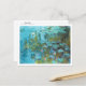 A fine art postcard featuring the painting by Claude Monet (1840-1926), Water Lilies 1914. Depicted is a tranquil pond landscape with green lily pads and pink flowers on striking blue water.