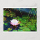 A single water lily blooms in a backyard water garden. The grass has overgrown over the sides of the pond as the water lily pads float on the top of the water. A small ripple appears as a koi fish samples the top of the water for any bugs. Water lilies provide food for fish and wildlife. Digital painting using Corel Painter.