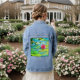 A fuchsia water lily with lime green foliage in turquoise water floats on this denim jacket.