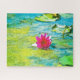 A fuchsia water lily with lime green foliage in turquoise water makes a Monet-inspired jigsaw puzzle.