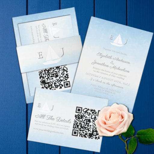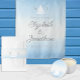 Blue watercolor depiction of the water meeting the sky. Custom monogram with sailboat