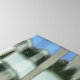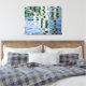 An unusual photograph of buildings reflected in water creating a colorful pattern printed on a canvas.