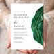 This elegant modern wedding invitation features an emerald green watercolor agate geode with faux foil highlights on a white background. Customise the charcoal grey text aligned with the left margin with the names of the bride and groom and the wedding details. The reverse side is a matching shade of solid emerald green.