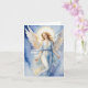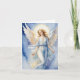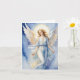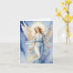 Watercolor angel with yellow wavy hair. Her arms spread by her sides, her eyes closed and her head bent down to the right as if in prayer. "Merry Christmas" written in light blue on the inside left.
