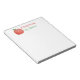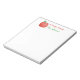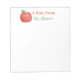 Cute notepad design for teachers features "a note from" and your name in the green and red script lettering, topped by a single red watercolor apple illustration.