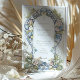 This graceful wedding invitation features a hand-painted Art Nouveau design in soft watercolor tones, perfect for couples seeking a refined and artistic touch. The front displays a romantic floral arch filled with blue, cream, blush, and soft sage green blooms, intertwined with swirling leaves and golden scrolls that create a vintage botanical frame around the wedding text.