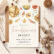 A modern and elegant rustic friendsgiving dinner invitation featuring hand-painted pumpkin pie, cranberry sauce, backed turkey, vegetables, traditional dishes and table setting elements.