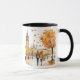 Coffee mug featuring a watercolor illustration of a couple walking in a city landscape on an Autumn / Fall day and a tree with falling leaves in the forefront. Additional sizes and rim and handle colours available.