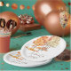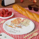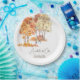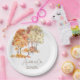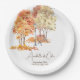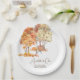 These romantic Fall inspired wedding plates feature a watercolor style image of a park. Golden trees with falling leaves create a canopy over a cosy park bench and street lamp. Coloured leaves are nestled beneath the trees, creating a perfect Autumn scene.