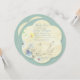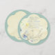 A unique baby shower invitation featuring a watercolor little bird on a branch. The overall flower shape is layered onto a blue-green background.
