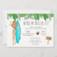 Tropical bachelorette beach party weekend invitation features watercolor blonde girl with surf board. Event details on back of invitation. Can be customised for any event.