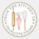 Baker pastry chef product labels featuring a round label baker's utensil tools, an elegant decorative open faced typography, with little gold hearts and border. Just add your name or business name. An eye catching style for your baked goods. You may use the simple design tool to change font style and colour of fonts.