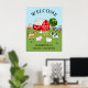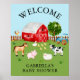 Cute welcome baby shower poster featuring cute farm animals and a red barn.