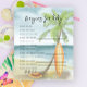 Baby on Board! Baby shower invitation - perfect for a summer baby shower. Beach theme. Watercolor design has a ocean and beach scene with surfboard, palm tree and summer hat.
