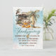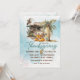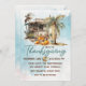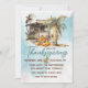 Beach Thanksgiving invitation on the beach with palm trees and sand with pumpkins and flowers.