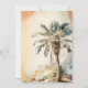 Elegant watercolor wedding invitations in moody vintage tones with a large palm tree, sign, and sunglasses.