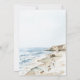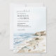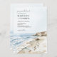 The wedding invitation design features hues of blue watercolors, capturing the essence of the ocean. Waves lapping up on the beach, merging with the sandy shoreline where footsteps trace a path towards the horizon. This visual sets the tone for a romantic beach wedding, inviting guests to share in the love and beauty of the moment. The style is modern, with an elegant serif type contrasted with a simple modern script handwritten type. The mood is minimal and serene.