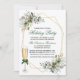 Elegant Watercolor Greenery Holiday Party Invitation includes beautiful watercolor botanical greenery, eucalyptus leaves, holly berries and other beautiful foliage. Gold Geometric Frame. Red Script. Champagne Glass with Green Bow.