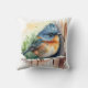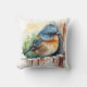 Watercolor bird with a mix of blue, orange, and white feathers perches on a wooden fence with a background of greenery