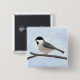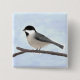 Pin-back button with my original digital watercolor illustration of a Black-capped Chickadee perched on a leafless twig against a pale blue sky.