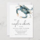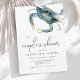 The perfect couple's shower invitation to celebrate the bride and groom, this coastal design features a blue crab in the upper corner in vibrant watercolors. The invitation text pairing is modern with a casual elegance that is both tasteful and hospitable. Personalise the text template with your specific details. This invitation is a wonderful choice for pre wedding celebrations in coastal areas, or where the gathering includes a crab feast, crab boil, or other seafood type of fare.