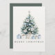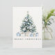 Send warm wishes wrapped in timeless elegance with this beautifully illustrated watercolor Christmas card. Featuring a serene evergreen Christmas tree adorned with soft blue ornaments, winter white poinsettias, topped with a silver star and delicate wrapped gifts in blue and neutral tones at the base. Merry Christmas greeting in font to match illustration below. The faux textured background and design captures the spirit of a cosy, classic Christmas. Solid colour and customisable holiday greeting and signature on reverse.