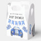 Race car theme baby shower invitation card featuring watercolor illustrations of a blue race car.