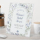 An assortment of blue tonal watercolor wildflowers and greenery makes the background for this bridal shower pedestal sign. A silver-edged arched frame displays all the information so you can either welcome your guests to the event or give instructions. Perfect for a wildflower-themed or boho bridal, couple's, or wedding shower, but you can customise it for an engagement party, anniversary celebration, baby shower, or birthday party. Available with matching products.