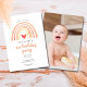 A cute first birthday photo invitation featuring a boho watercolor rainbow and heart and stylish typography, and a special photo on the reverse. Designed by Thisisnotme©