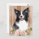 Realistic black and white Border Collie dog watercolor portrait illustration with pretty floral spray on faux wood panel background.