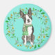 Watercolor depicting a sweet Boston terrier with little knitted scarf. Wreathed with vines on an light Arcadia Green ground.