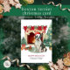 A cute watercolor Boston Terrier dog Christmas card features pretty watercolor graphics of a spirited Boston Terrier wrapped in Christmas lights near a fireplace and Christmas tree. Personalise with your family and dog's name.