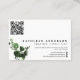 Dark green watercolor leaves botanical business card template with QR code and hand-drawn vine and floral accent. This business card design is easy to customize by adding your own logo. Create and add your own uniques QR code to easily direct clients to your website.