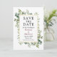 Modern Elegant Watercolor Botanical Greenery Save The Date Card includes eucalyptus leaves and botanical greenery foliage on a gold frame. Burgundy Back.