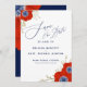 Nautical Boutique Co.'s red, white, and blue Save the Date design features beautiful watercolor red anemone windflowers with blue centres. Modern flowing script typography is paired with traditional block lettering, giving the design upscale style. #Nautical #Anemone #SaveTheDate #SaveOurDate