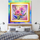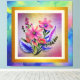 A Watercolor Gouache Bouquet flowers with textures, framed in gold, set against a beautiful colourful backdrop.
